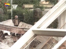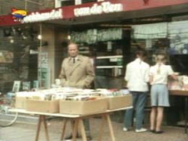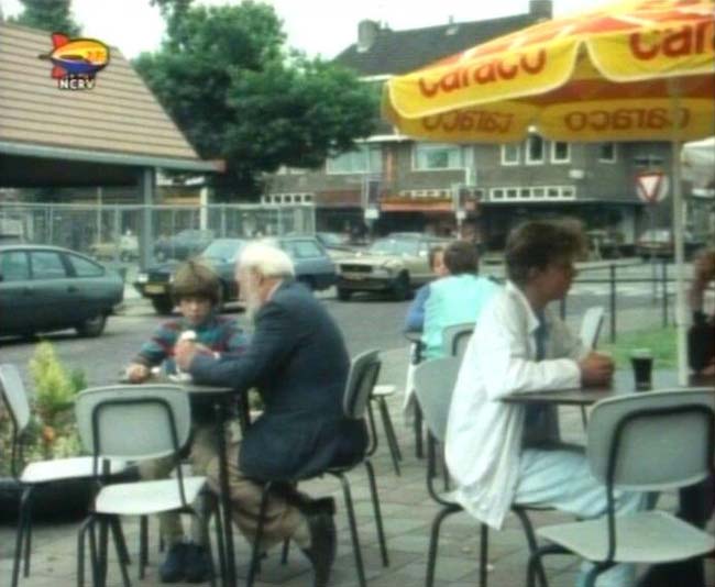 staan en tenslotte stoppen ze op een plek met een hoge flat op de achtergrond, dit is de flat op de hoek van de Koningsweg en de