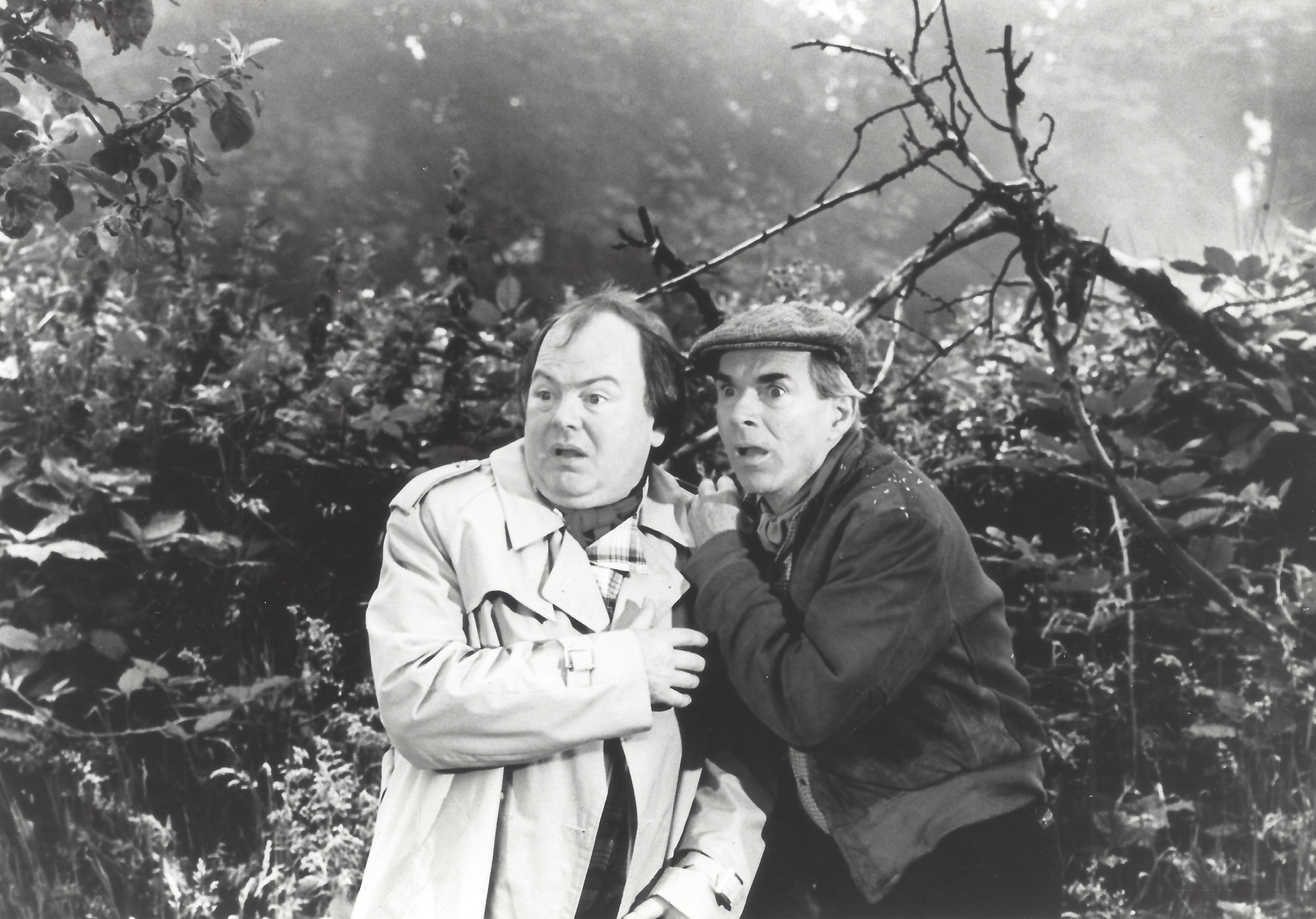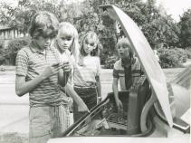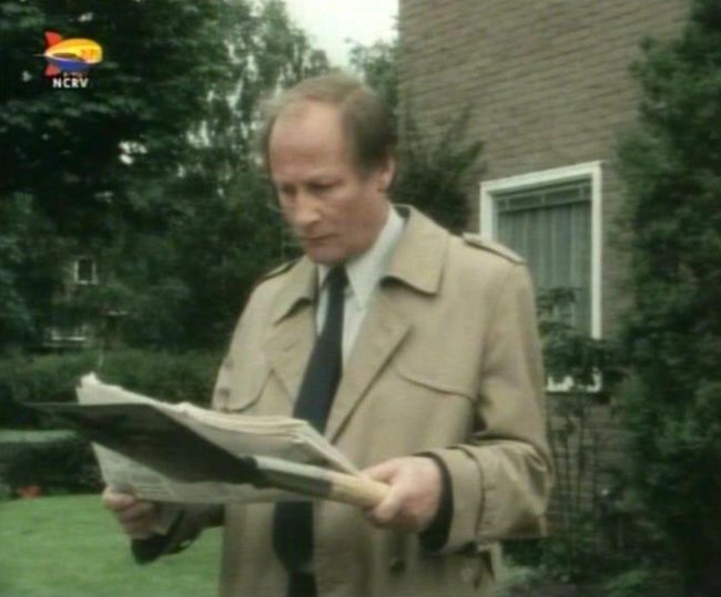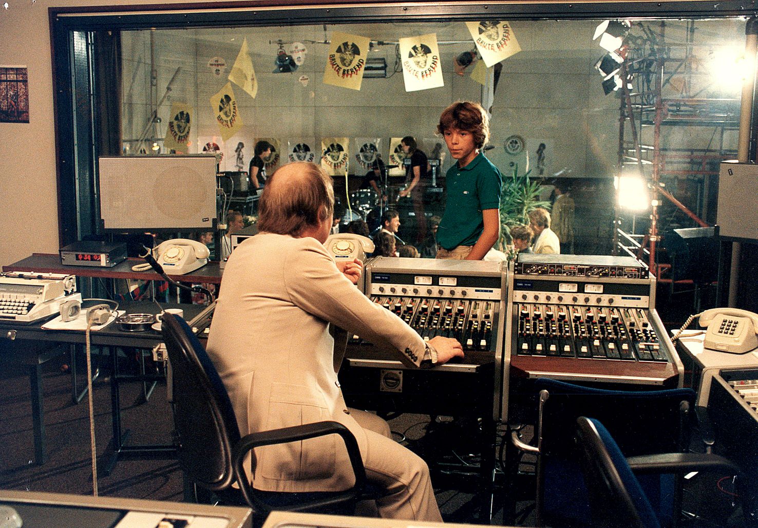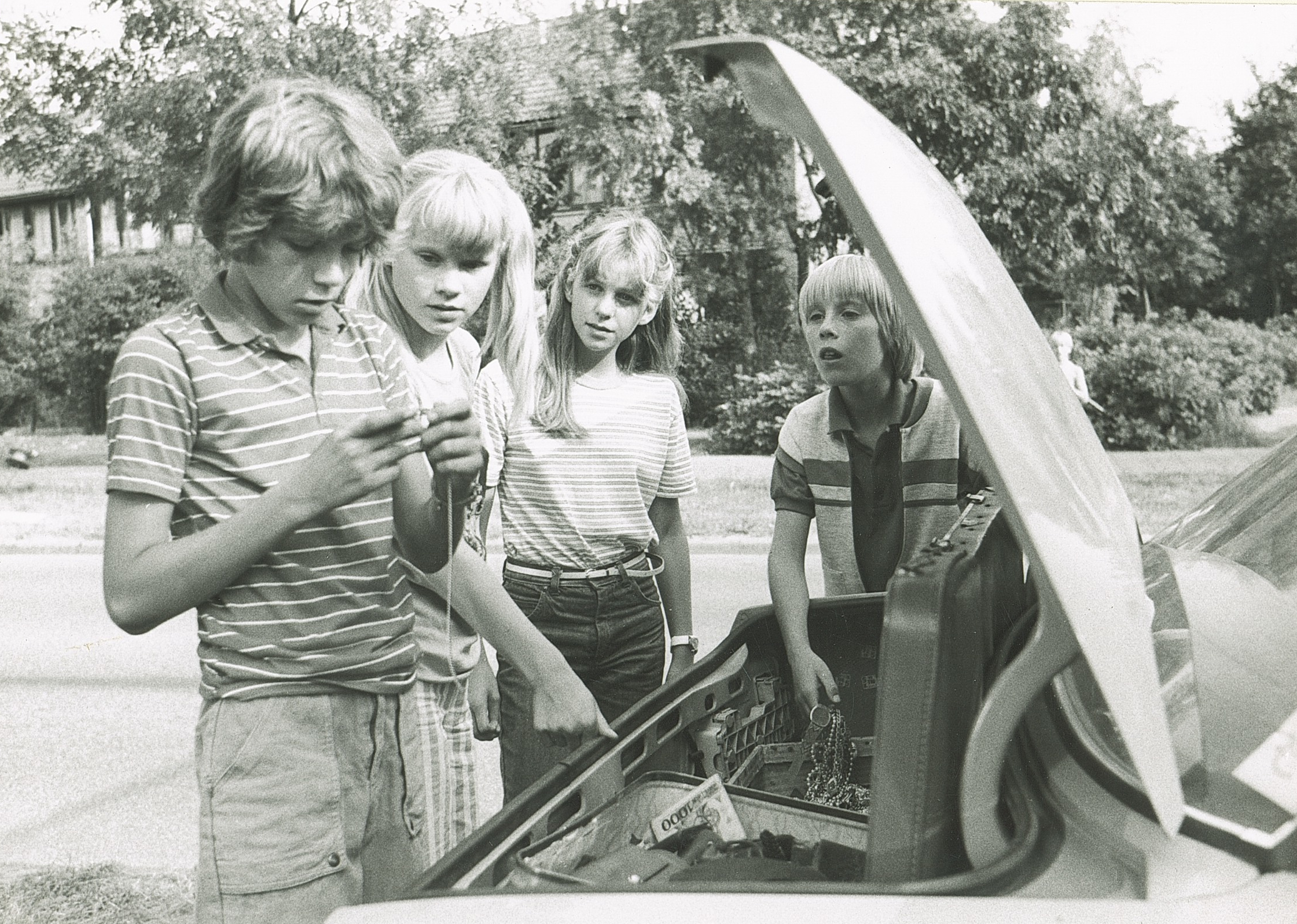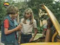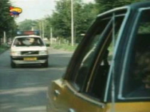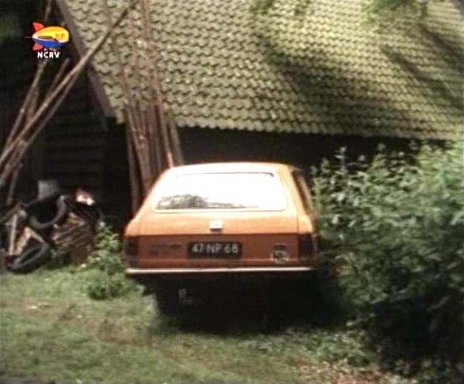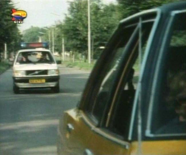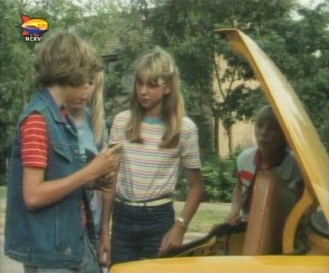 opnamen maakten in Soest terwijl ik achter het stuur van een oranje Ford Taunus zit. Er was een hele installatie gebouwd achterop de filmauto waardoor de auto